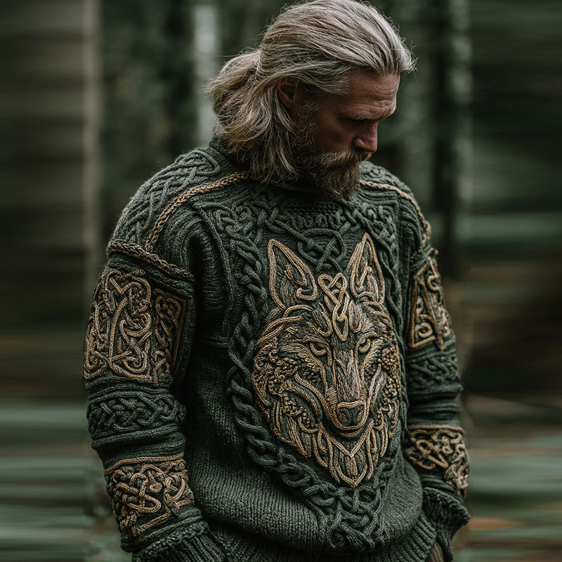 Men’s Vintage Viking Wolf Pattern Cozy Knit Turtleneck Pullover Sweater