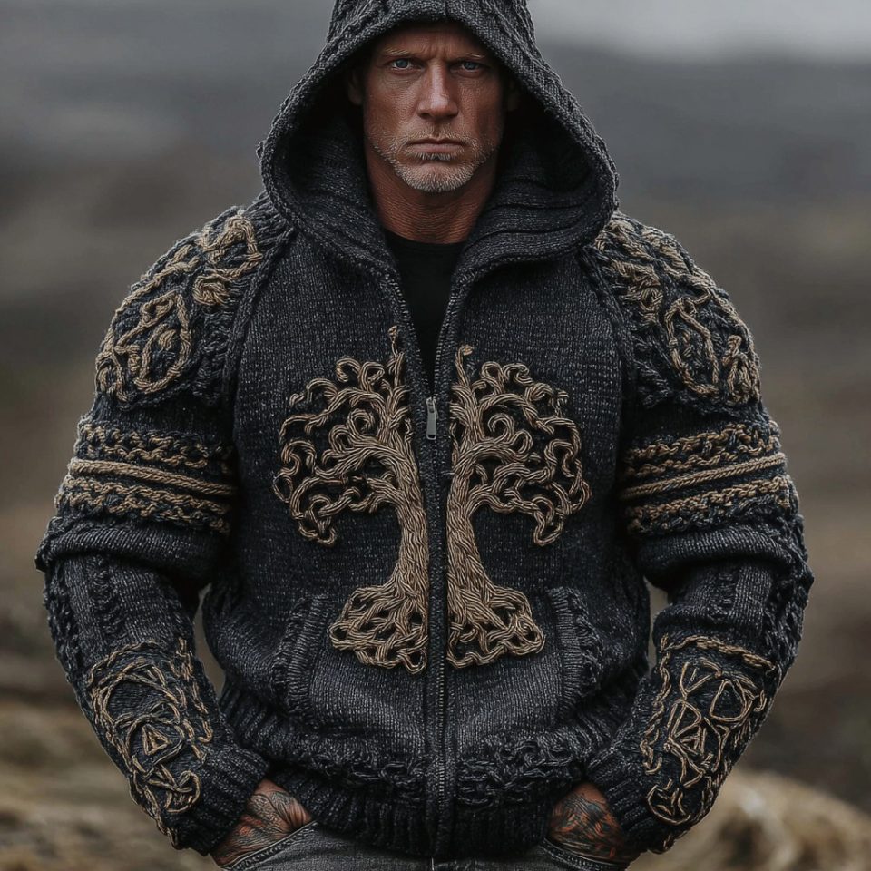 Men’s Vintage Viking Life Of Tree Jacquard Knit Zipper Aran Sweater Hooded Cardigan