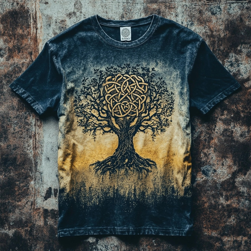 Men’s Vintage Viking Tree Of Life Embroidered Gradient Washed T Shirt