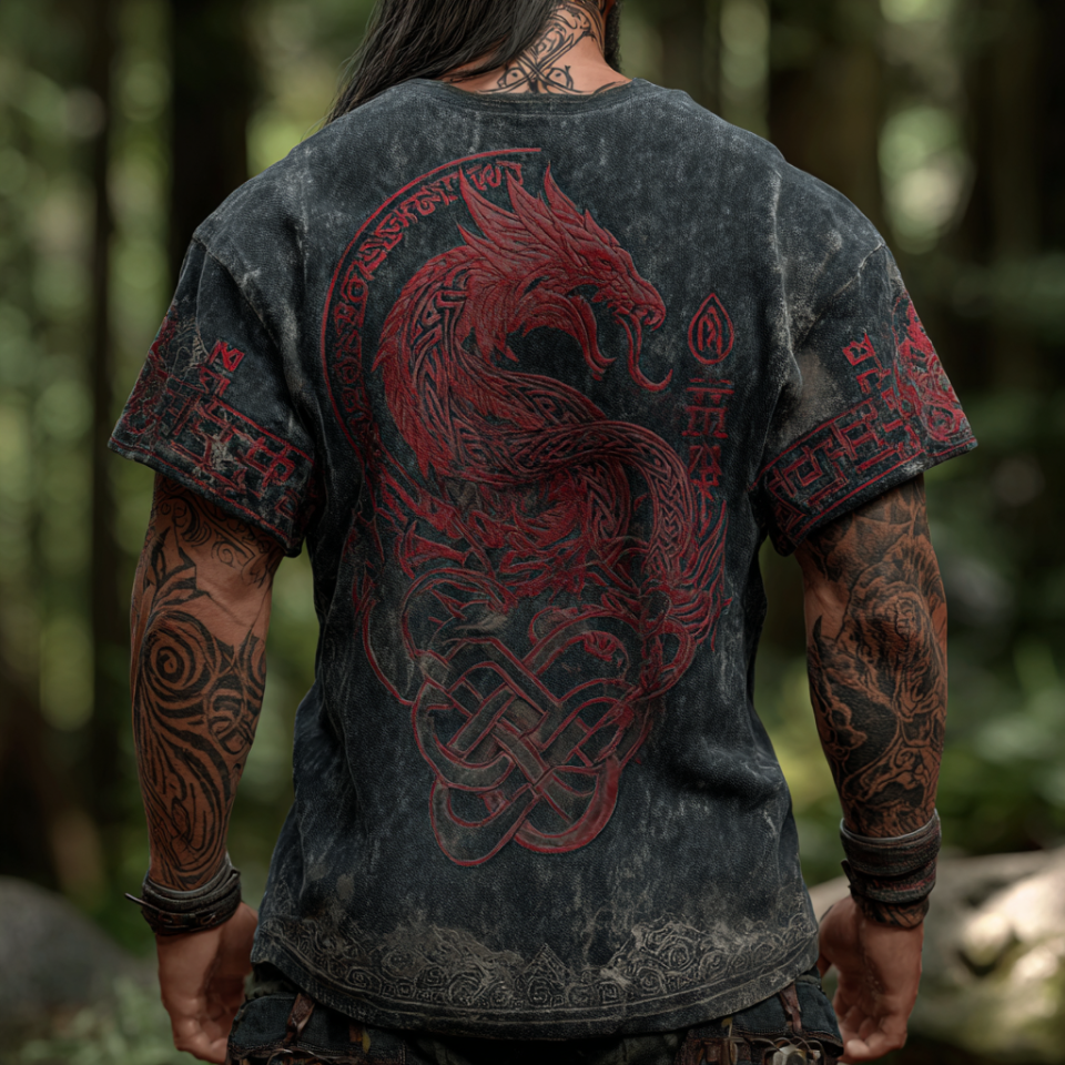 Men’s Nordic Viking Mythology Celtic Dragon Totem Hooded T-shirt