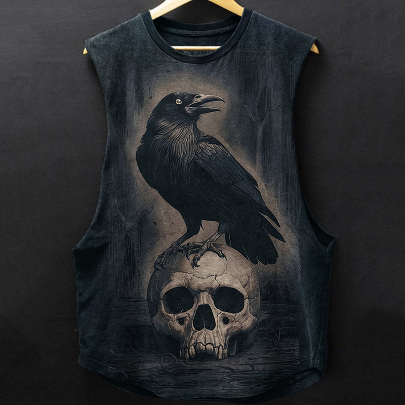 Vintage Viking Raven Standing On A Skull Print Washed Gym Vest