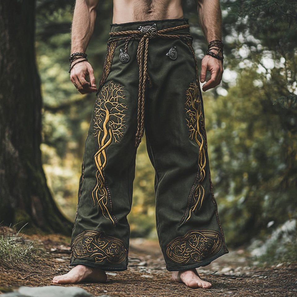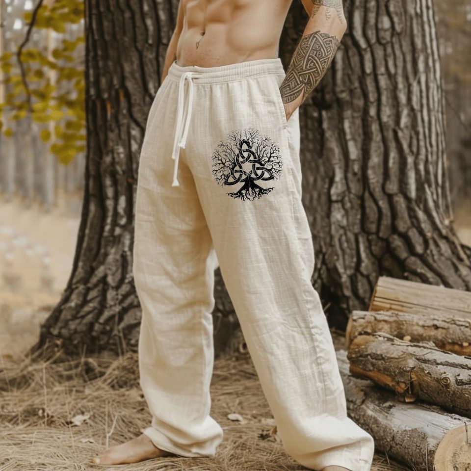 Vintage Viking Life Of Tree Embroidery Art Linen Loose Wide-leg Pants