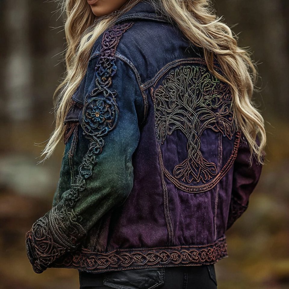 Women’s Vintage Viking Celtic Knot Tree Of Life Art Gradient Pattern Denim Jacket