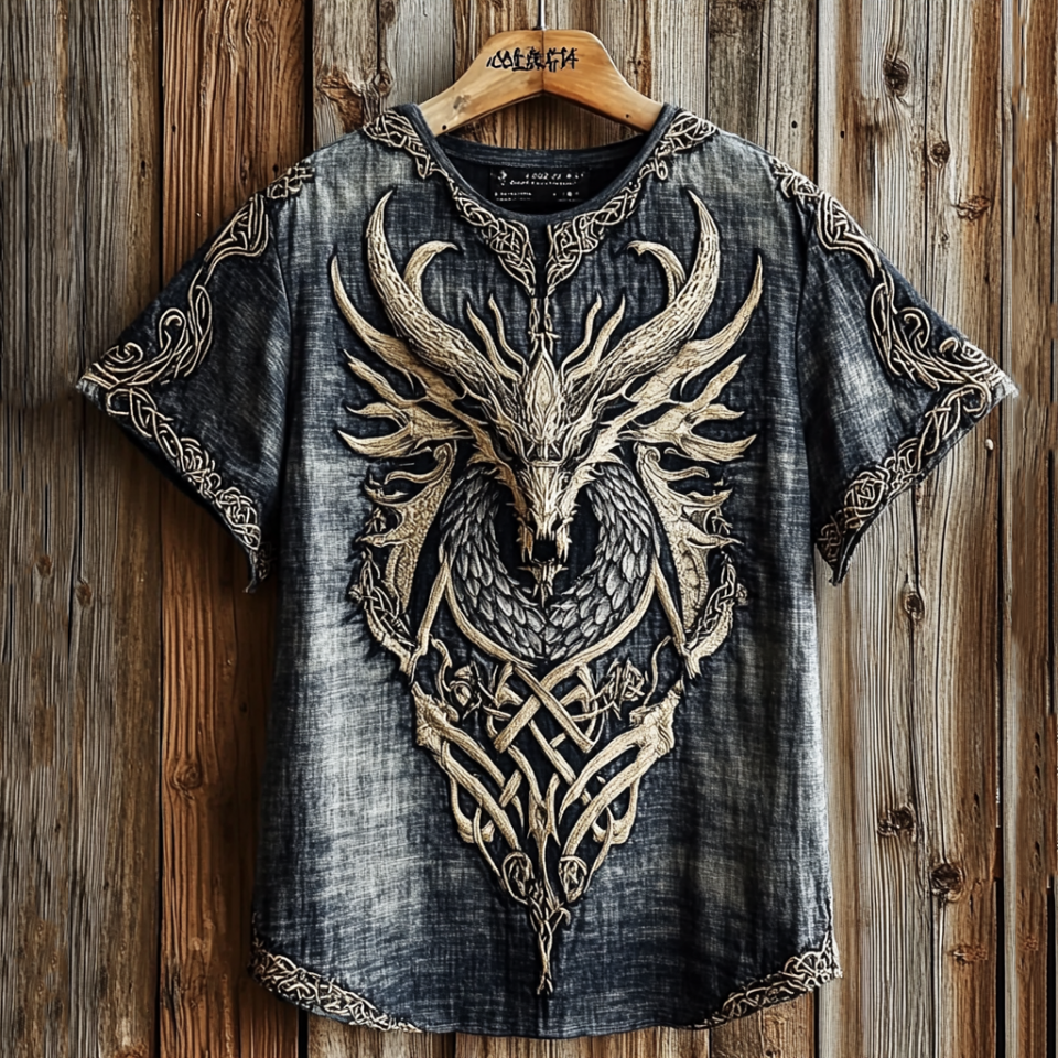 Men’s Viking Celtic Wolf Head Washed Contrast Color Linen T-shirt